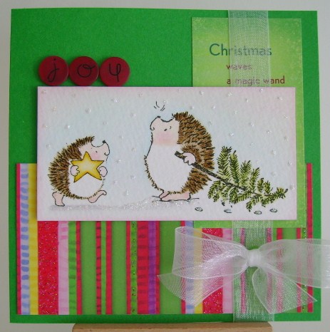 i created this card for the penny black saturday challenge, which is a fun sketch from design team member debby that i rotated. i’m enjoying the red and green for a change from my untraditional christmas colours. the image was watercoloured, distressed with pink along the edges and popped on foam tape. glossy accents cover the star and i added my usual stickles snowflakes. instead of manually making another one handed bow, i used the bow easy this time – 8 minutes. i’m also submitting this to the simon says stamp challenge – 3 Types of Embellishments (buttons, ribbon, stickles), 2 Patterned papers, 1 Image and to splitcoaststampers’ monthly fan club challenge. thanks for popping by.