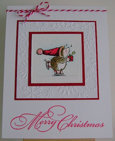 i made this clean and simple card for the penny black saturday challenge of christmas + red + embossing, which was very challenging. the image is coloured with distress inks with stickles on his hat and you might be able to see the stickles for snow; it’s so dull this morning and we’re supposed to get some of that white fluffy stuff. thanks for popping by.