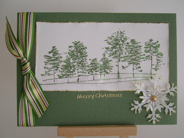 this is also for Friday’s Free 4 All challenge to “think snow…man!” i distressed the edges, sponged them with gold ink and did the same to the snowflakes – one is felt and one is punched. a gold dew drop was added to the centre. i added stickles to the trees and ground and added the ribbon. the sentiment is a peel off. thanks for popping by.