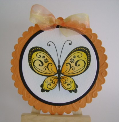 i combined 5 splitcoast dare to get dirty challenges plus this week’s flutterby wednesday challenge to create this circle card. the image is heat embossed, watercoloured and die cut with circle nestabilities. the base was embossed and then die cut also. thanks for popping by.