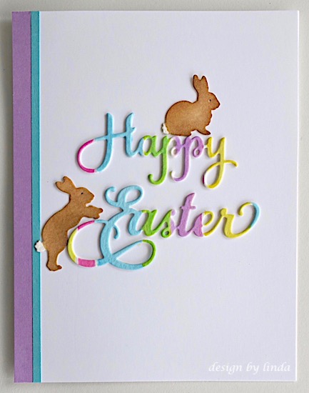 i used my painted stripes for the Impression Obsession happy easter die (DIE367-J); the IO die cut bunnies (DIE168-C) were painted with twinkling H2Os on cold press watercolour paper and then i sponged the edges with walnut stain distress ink. i finished off the card with some scraps of paper in coordinating colours.