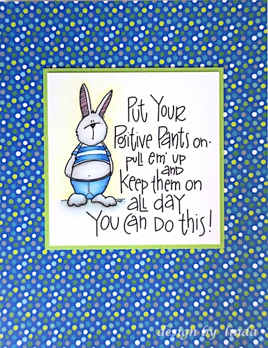 but i know family and friends are getting tired of the restrictions so i’m playing along with the Impression Obsession Challenge to create funny cards that i hope will make them smile. once again i’ve used the free Impression Obsession digi (NOLA003-DG Positive Pants) and pencil crayons to create this masculine card.