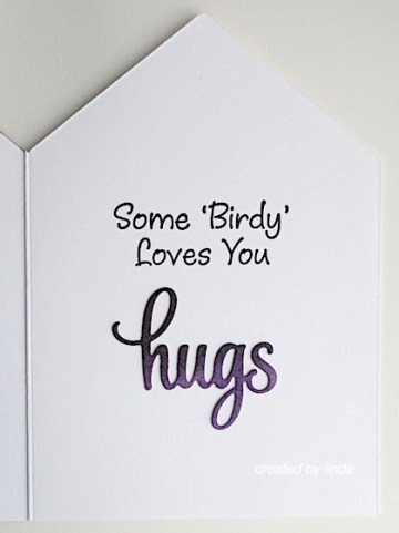 I placed the house die over the left edge for a side fold card and I stamped the IO sentiment ‘some birdy‘ (A5418 ) on the inside along with the IO hugs (DIE516-A), sponged with dusty concord and black soot distress inks.