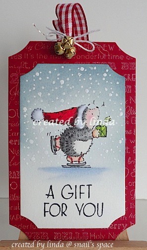 the Penny Black Christmas Park wood stamp was heat embossed with black embossing powder and then i sponged the sky with blue distress inks and added some falling snow.